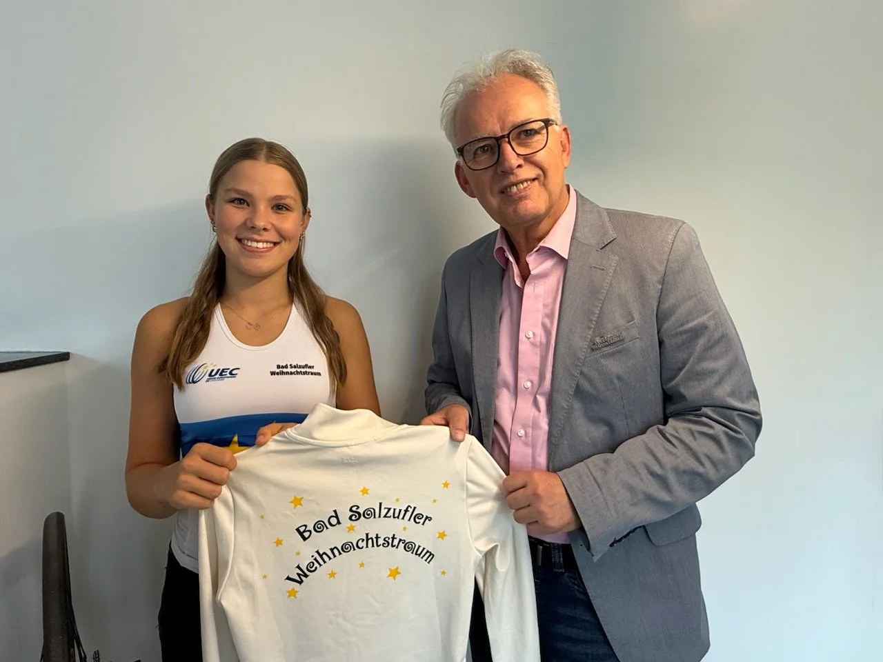 Ein junges Mädchen und ein älterer Mann stehen nebeneinander und halten ein weißes T-Shirt, auf dem steht "Bad Salzufler Weihnachtsstraum" mit Sternen. Das Mädchen trägt eine weiße Sportweste, der Mann trägt einen grauen Blazer und eine rosa Hemd. Beide lächeln.